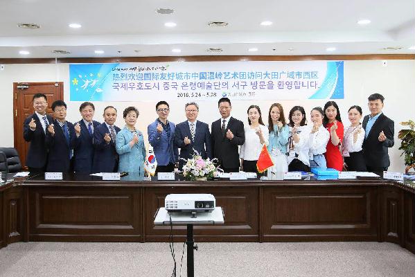 在抵达大田西区当天,艺术团一行受到大田西区区长接见的高规格接待。 韩国大田广域市西区与温岭市是国际友好交流城市,2006年双方正式签订友好交流协议。数年来,两地在领导互访、互派公务员、青少年交流、经贸交流等方面都取得了不少成效。今年西区代表团来温岭访问时,签署了文化合作协议,以促进民间和文化交流活动,深化交流合作。