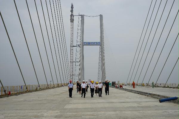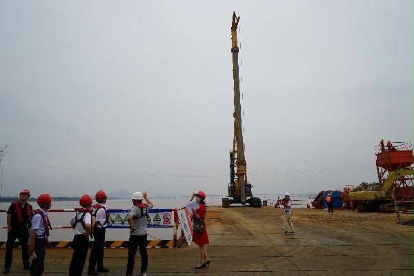 在沿海高速台州湾大桥施工现场,一行人现场听取项目书记的情况介绍。台州沿海高速是台州投资最大的交通基础设施项目,建成后将有助于进一步开发利用好台州东部空间优势和海洋资源,提升台州区位优势,促进全市经济社会跨越发展。而台州湾大桥是沿海高速的控制性工程,总投资17.34亿元,全长4038米,塔柱高171米,其中单个主墩承台有32根桩基,平均桩长达145米,最长桩长达158米,是目前已知国内入土最深的“第一深桩”,为国内桥梁施工之最,其施工难度可想而知。面对难题,项目部抽调精干力量,成立克难攻坚突击队。通过不断摸索对比,反复实践改进,突击队终于成功破解历史难题,从而保障项目整体推进。5月23日上午,随着最后一方混凝土的注入,台州沿海高速台州湾大桥主体桥梁成功合龙,为年底台州沿海高速全线建成迈出坚实的一步。